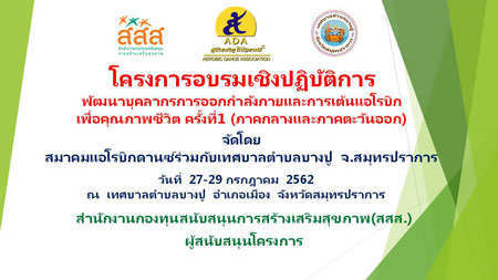 โดยการสนับสนุนของสำนักงานกองทุนสนับสนุนการสร้างเสริมสุขภาพ(สสส.) จัดการอบรมเชิงปฏิบัติการพัฒนาบุคลากรส่งเสริมการออกกำลังกายและเต้นแอโรบิกเพื่อคุณภาพชีวิต ทั่วทุกภาคของประเทศไทย